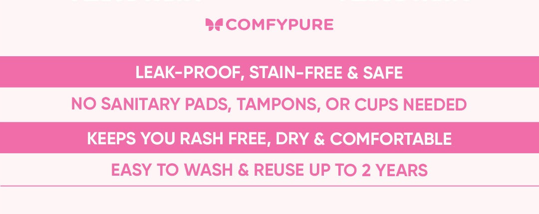 ComfyPure Period Panties have built-in absorbent layers and a leak-proof barrier that trap and hold menstrual flow. They provide 12–15 hours of protection, depending on your flow.